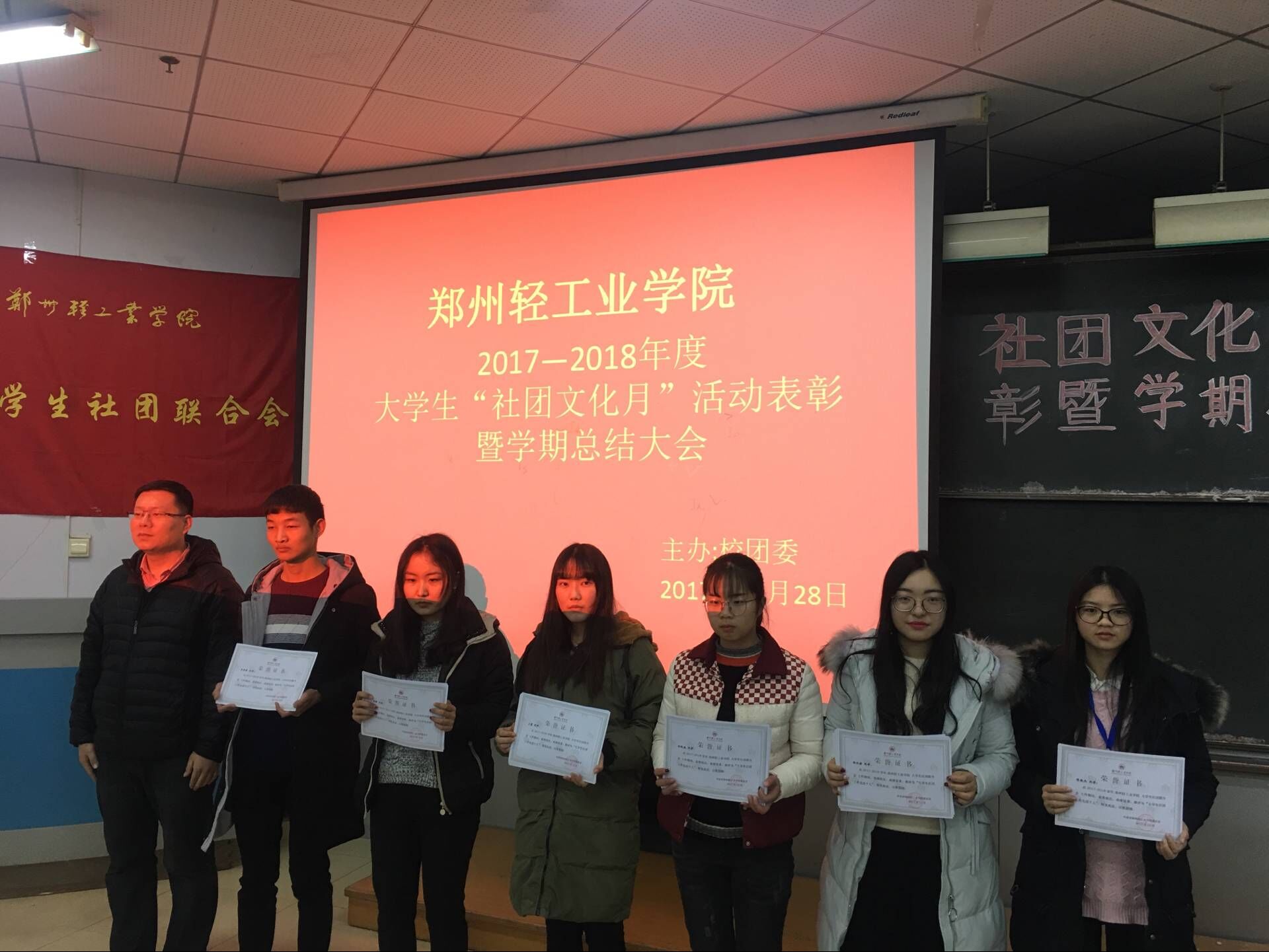 在过去的一学期中,大学生社团联合会在校党委的正确领导和校团委的具体指导下,引导、服务、管理、监督东风校区31个学生社团开展工作,一直本着“自我服务、自我管理、自我教育、自我监督”的理念,按照“一心双环”团学组织格局,致力于我校的学生社团发展和校园文化建设。为把我校社团打造成轻院特色品牌而不懈奋斗。 为进一步促进学生社团“规模化、精品化、特色化”建设,促进学生社团健康发展、举办更多有意义的精品活动。12月28日下午,由大学生社团联合会举办的“2017-2018学年上学期社团潮表彰暨总结大会”在东风校区教三102教室举行。出席本次会议的嘉宾有:校团委副书记景志勇老师、大学生社团联合会主席团。本次大会由大学生社团联合会副秘书长王慧洁主持。 大会第一项,大学生社团联合会书记史晨曦做期末工作总结,她的讲话总结了本学期来各个社团的优秀活动,表达了对下一学年社团发展的美好期许。大会第二项:颁奖环节。主持人宣布奖项设置和评选标准。这次表彰共分为四个奖项:最具影响力奖、最佳组织奖、最佳创意奖、最佳人气奖、最佳合作奖、最具潜力奖、最佳进步奖。评选表准也是根据不同的奖项,设置相对应的标准。大会第三项:对本学期社团社联优秀个人颁发证书,以资鼓励。大会第四项:由四类社团派代表做学期工作总结。大会第五项:校团委副书记景志勇老师上台发表讲话,他提出社团活动应该高标准严要求的去开展,丰富在校学生第二课堂,展现轻院学子风采。各项奖项获奖情况:最具影响力奖:青年志愿者协会、英语沙龙协会、演讲与口才协会;最佳组织奖:营销协会、武术协会、交谊舞协会、轮滑社、计算机爱好者协会;最佳创意奖:武术协会、棋类协会、山水蒙汉服社、读书协会、驼铃文学社、摄影协会、创意手工艺协会、书画协会;最佳人气奖:演讲与口才协会、青年志愿者协会、英语沙龙协会;最佳合作奖:羽毛球协会、绘音社、交谊舞协会;最具潜力奖:电子科技协会、网球协会、乒乓球协会、动漫社;最佳进步奖:创意手工艺协会、健身健美协会、无线电协会、足球协会。 学生社团是当代大学生生活里的重要组成部分,社团活动丰富了广大在校学生的课余生活,扩大了学生的知识面、交际面,提供了更多社会实践的平台,是拓展学生素质的重要载体。因此,多举办一些高质量高水平的社团活动也极为重要,希望通过此次表彰大会,各个协会都可以从其他协会中取其精华,继续发扬自己协会的优点,让各自协会发展地越来越好。