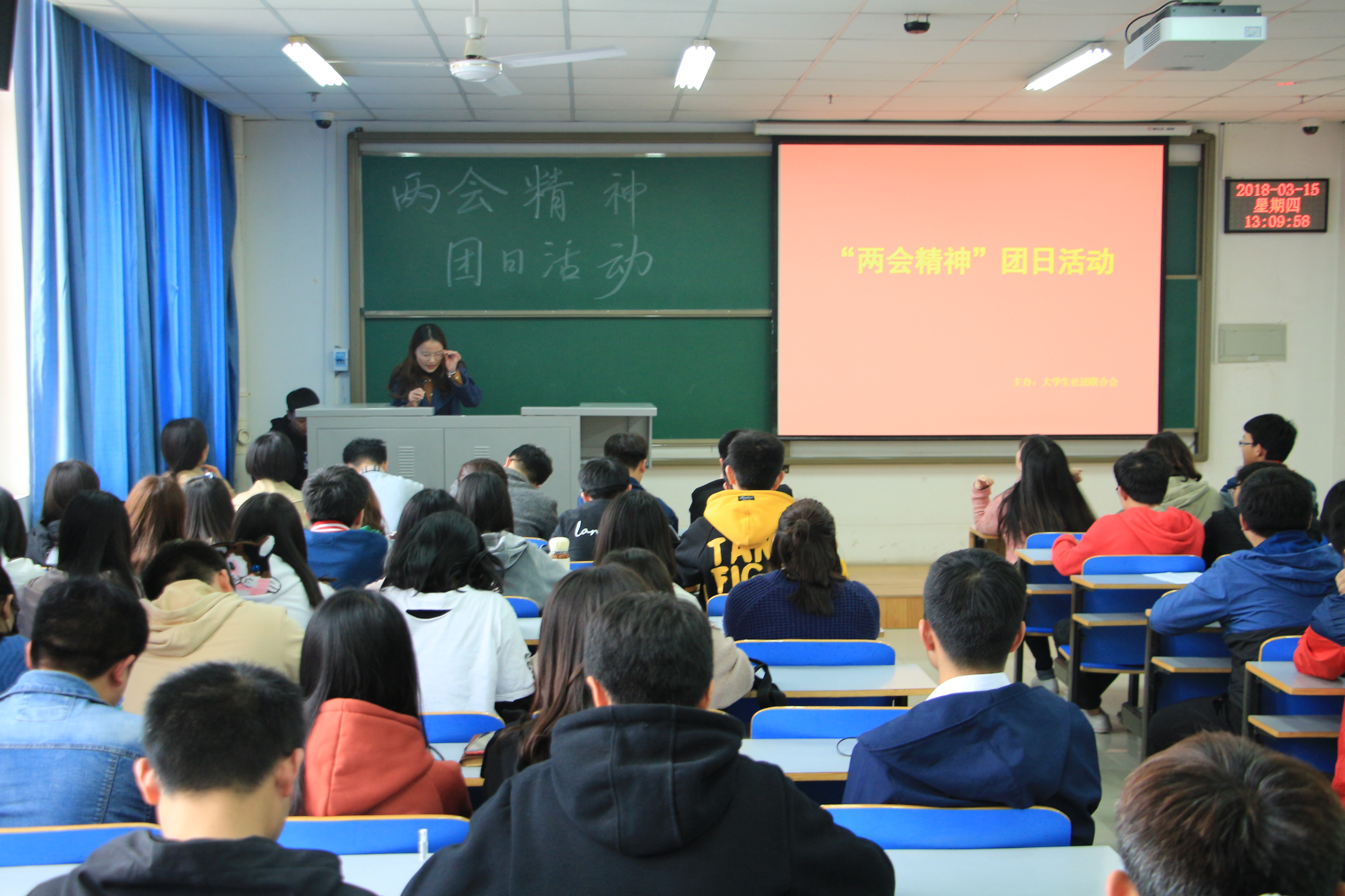 为了培养当代大学生对国家大事的关心度,及时快捷的将国家发展新方向传递给作为新时代接班人的大学生,同时也为了更好的进行社联本学期接下来的工作,3月15日,由大学生社团联合会主办的学习两会精神暨全体大会在科学校区二教楼708室顺利举办,出席本次大会的有社联主席团成员、各部门副部长及大一全体干事,本次会议由监察部副部长黎可欣主持。 活动开始前,由组织部成员负责与会成员的引导入座及签到工作。下午一点,待与会成员就坐后,主持人宣布大会正式开始。首先由主持人介绍了一些两会精神内容总结并播放了两会中的截选视频,期间同学们都认真观看,仔细聆听习总书记对全国人民的报告,同学们一个个沉浸在祖国越加强大的深深自豪之中。视频播放结束,接下来进行社联全体大会,大会先由社联每个部门挑选一名副部长代表上台对本部门上学期的工作做了简单总结并对本学期接下来的工作规划做了简单的陈述。在陈述中,他们都对本学期接下来的工作充满了期待,并在发言最后表达了对社联未来发展的美好憧憬以及对部门大一干事的殷切期望。随后由社联主席团副秘书长叶铭上台随机抽点大一干事进行发言,在发言中,他们都表示很幸运加入到社联这个美好幸福的大家庭中,在这里认识到了一群可爱的人并学到了很多受益匪浅的东西,得到了锻炼与成长。最后,由社联常务副书记袁正进行总结发言,他讲到:两会精神是作为学生干部都要自觉主动去关注的问题,它对于我们的学习和生活都有很大的帮助,他也对下学期社联工作的顺利开展表示十分期待,希望社联成员可以砥砺前行,争创佳绩。最后主持人宣布本次大会顺利结束。 在本次全体大会,同学们积极分享自己的寒假经历和未来展望,表达对社联的美好期望和对自己的严格要求,相信社联会在未来的发展中越来越好。通过两会精神的学习,同学们更加具体深刻地了解了我国目前的政治经济发展,对国家政策也有了相关的认识,也更加明确了新时代青年学生的责任与担当。