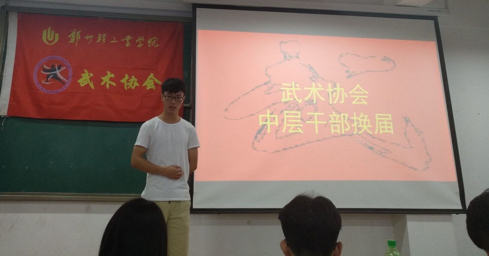 6月3号下午,由校团委主办、武术协会承办的武术协会17级中层换届大会在郑州轻工业学院科学校区经济与管理学院系楼211室举行。出席此次换届大会的嘉宾有科学校区武术协会15级会长林静,15级书记李奇伟,副会长赵志超,仝志浩;东风校区武术协会协会秘书长何雪芳;青年志愿者协会,篮球协会,棋类协会等各协会代表。本次换届大会由武术协会副书记杨粵薇主持。 大会伊始,由主持人介绍各位参会来宾并宣布换届大会开始。紧张激烈的氛围之下,各个竞选者也蓄势待发。接下来8位17级换届成员一一上台进行演讲,通过放映PPT,演讲等方式来表达自己的竞选意向,优缺点,能力范围以及自己未来的工作计划。演讲结束后,各位学长学姐对他们提出自己的问题与看法,演讲者对问题一一做出回答。竞选成员演讲完毕,由副书记杨粵薇对本次换届大会进行总结性发言:灿烂的话语只是一个好的开始,朴实的行动才能开出成功的鲜花,希望17级理事们脚踏实地的为武术协会贡献自己的力量。最后宣布此次换届大会圆满成功,会场一片沸腾,充满激情与活力。大会结束后,与会人员进行了合影留念,在这张武术协会的“全家福”中,深深蕴含着每一个人对武术协会深厚的感情。 通过本次换届大会,展现了每一位参选换届成员对武协的热爱,愿意为武协的发展奉献出自己的一份力量的决心,同时也为武协的中层干部注入了新鲜血液,更为武术协会下学期工作的开展做了坚实铺垫。相信武术协会在接下来的时间里会更加蓬勃的发展。
