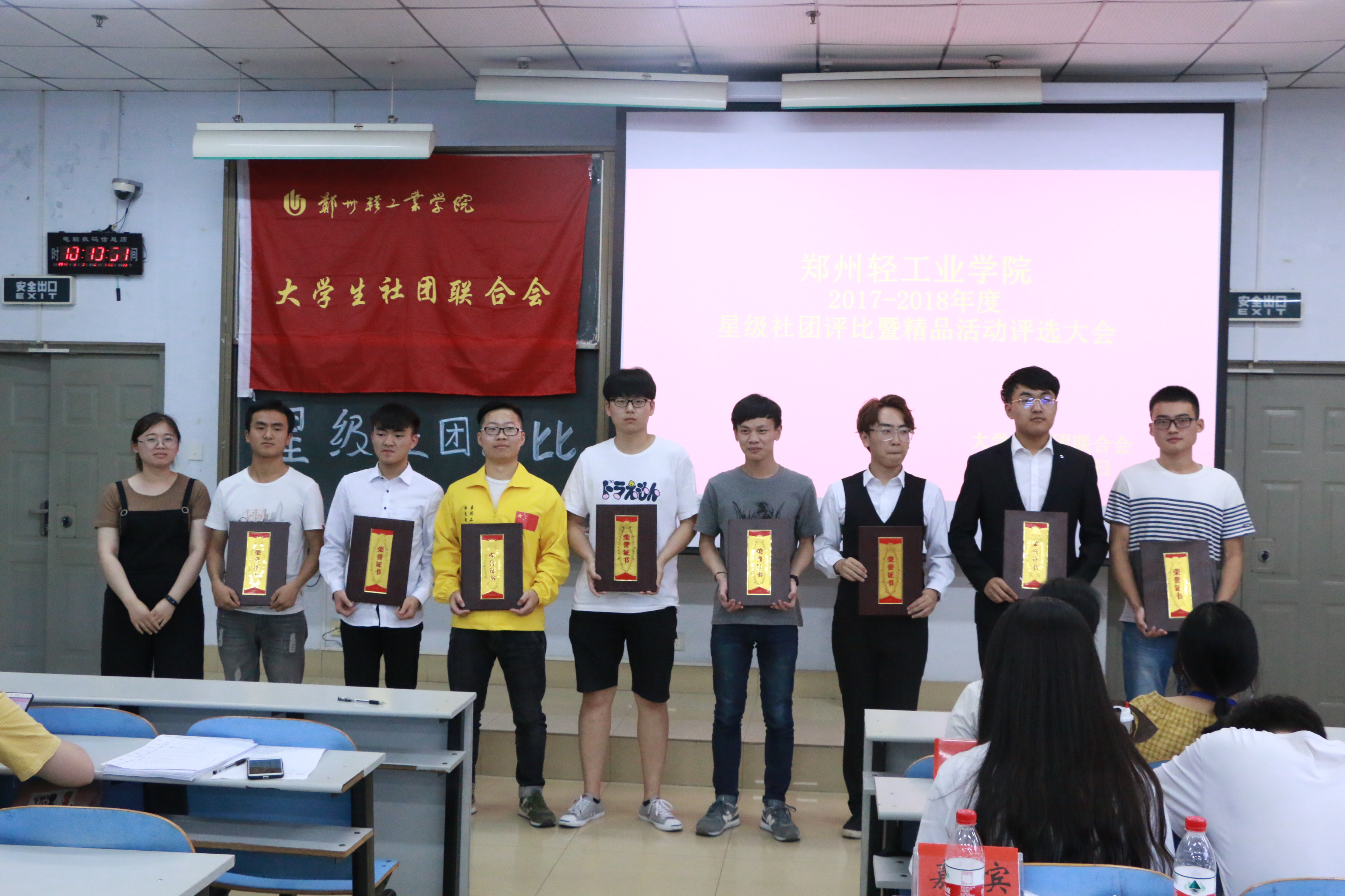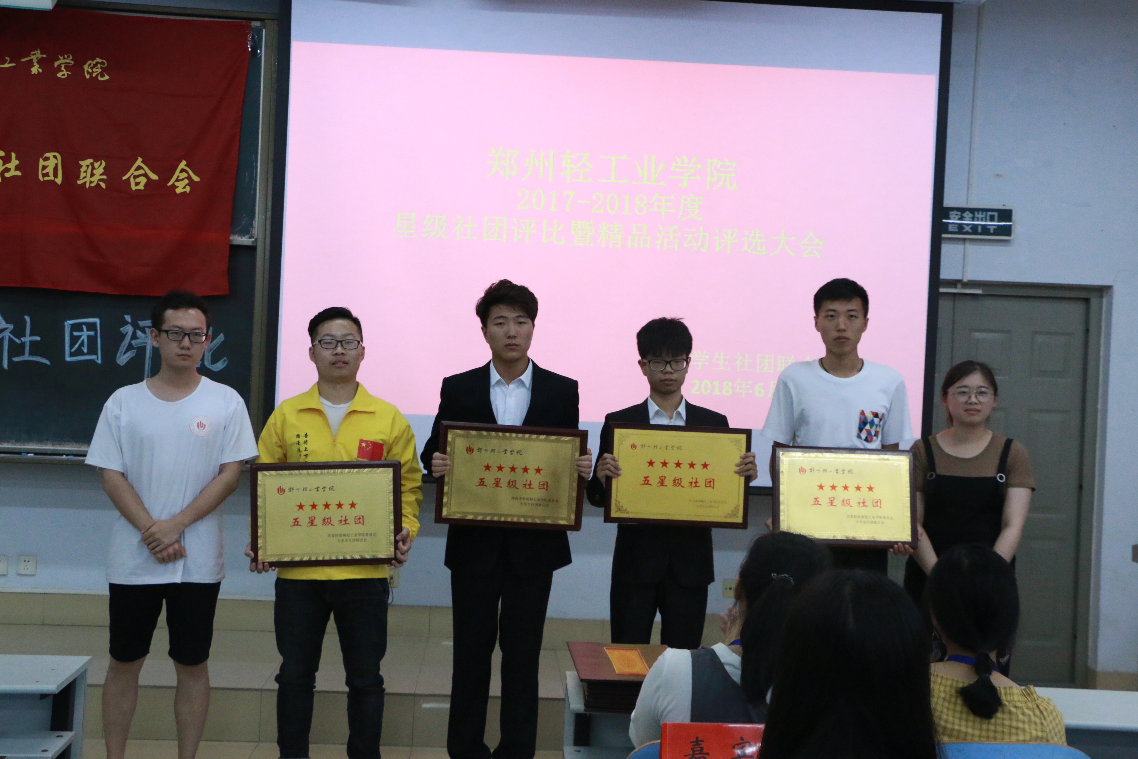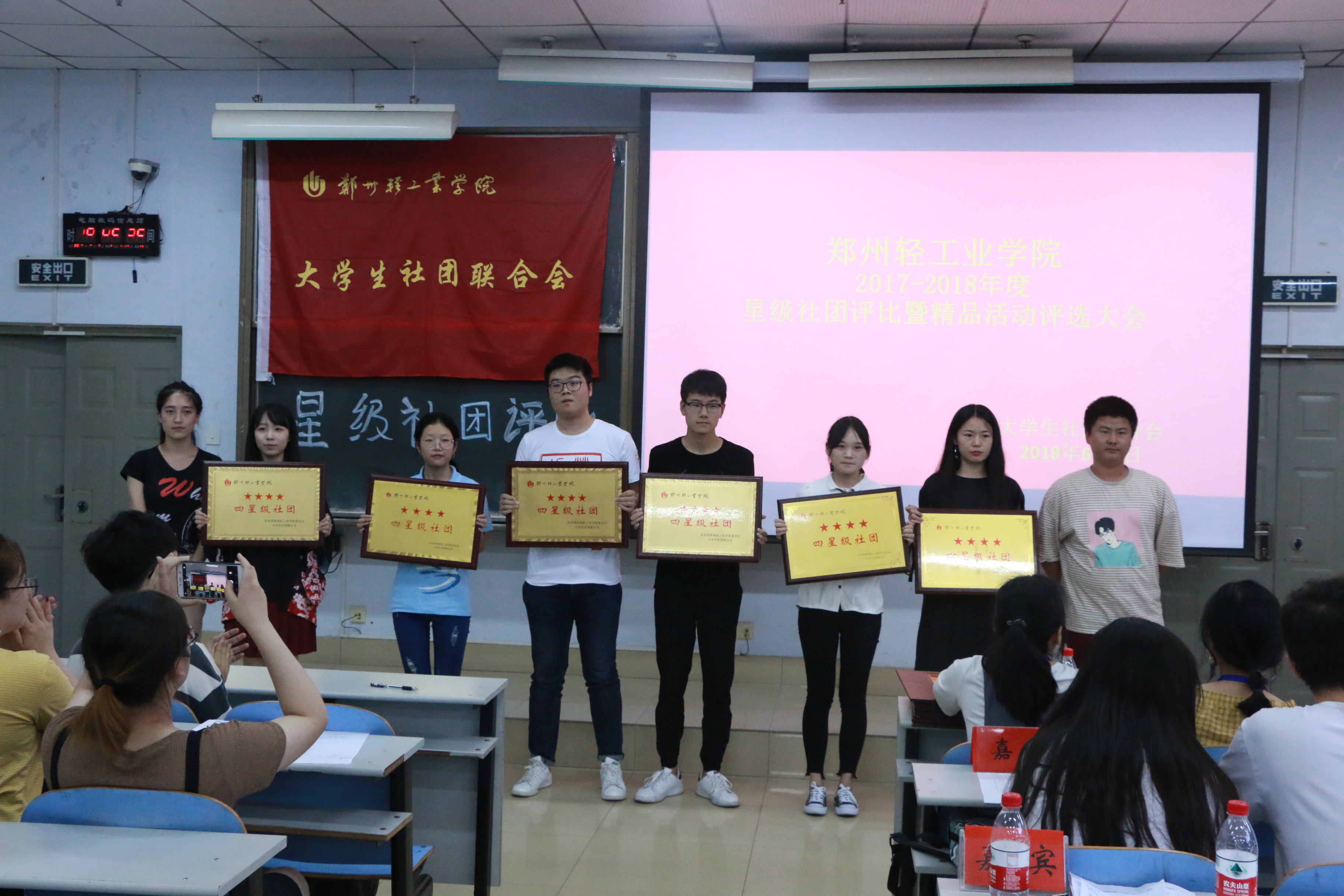 附:社团获奖名单 郑州轻工业学院(东风校区)2017-2018年星级社团名单: 五星级社团:演讲与口才协会、青年志愿者协会、英语沙龙协会、武术协会 四星级社团:羽毛球协会、营销协会、轮滑社、心理协会、动漫社、交谊舞协会 三星级社团:电子科技协会、山水蒙汉服社、计算机爱好者协会、驼铃文学社、读书协会、书画协会、无线电协会、乒乓球协会 精品活动:英语沙龙协会“英语四六级模拟考试”、演讲与口才协会“星光杯社团联合辩论赛”、计算机爱好者协会“义务维修电脑活动”、心理协会“心理文化艺术节文艺演出”、武术协会“轻武国魂”、无线电协会“五五节通联活动”、电子科技协会“家电义务维修”、乒乓球协会“社团交流赛”。 郑州轻工业学院(科学校区)2017-2018年星级社团名单: 五星级社团:青年志愿者协会、英语沙龙协会、演讲与口才协会、电子科技协会、营销协会 四星级社团:读书协会、食品安全与健康协会、排球协会、环保协会、社会工作促进会、摄影协会、篮球协会 三星级社团:A+skater轮滑社、书法协会、动漫协会、武术协会、花艺协会、乒乓球协会、交谊舞协会、计算机爱好者协会、羽毛球协会。 “新锐成长”奖:HelloRunner跑团、网球社、山水蒙汉服社 “精诚合作”奖:大学生法律援助中心、足球爱好者协会、青年志愿者协会 “巧思创新”奖:花艺协会、健身健美协会、营销协会