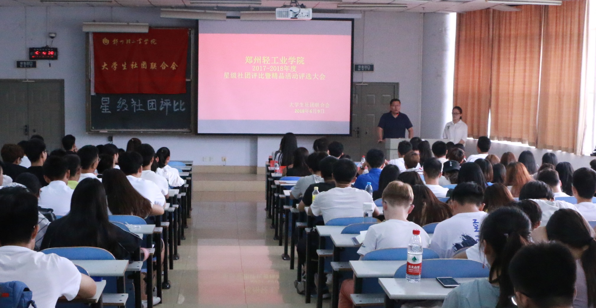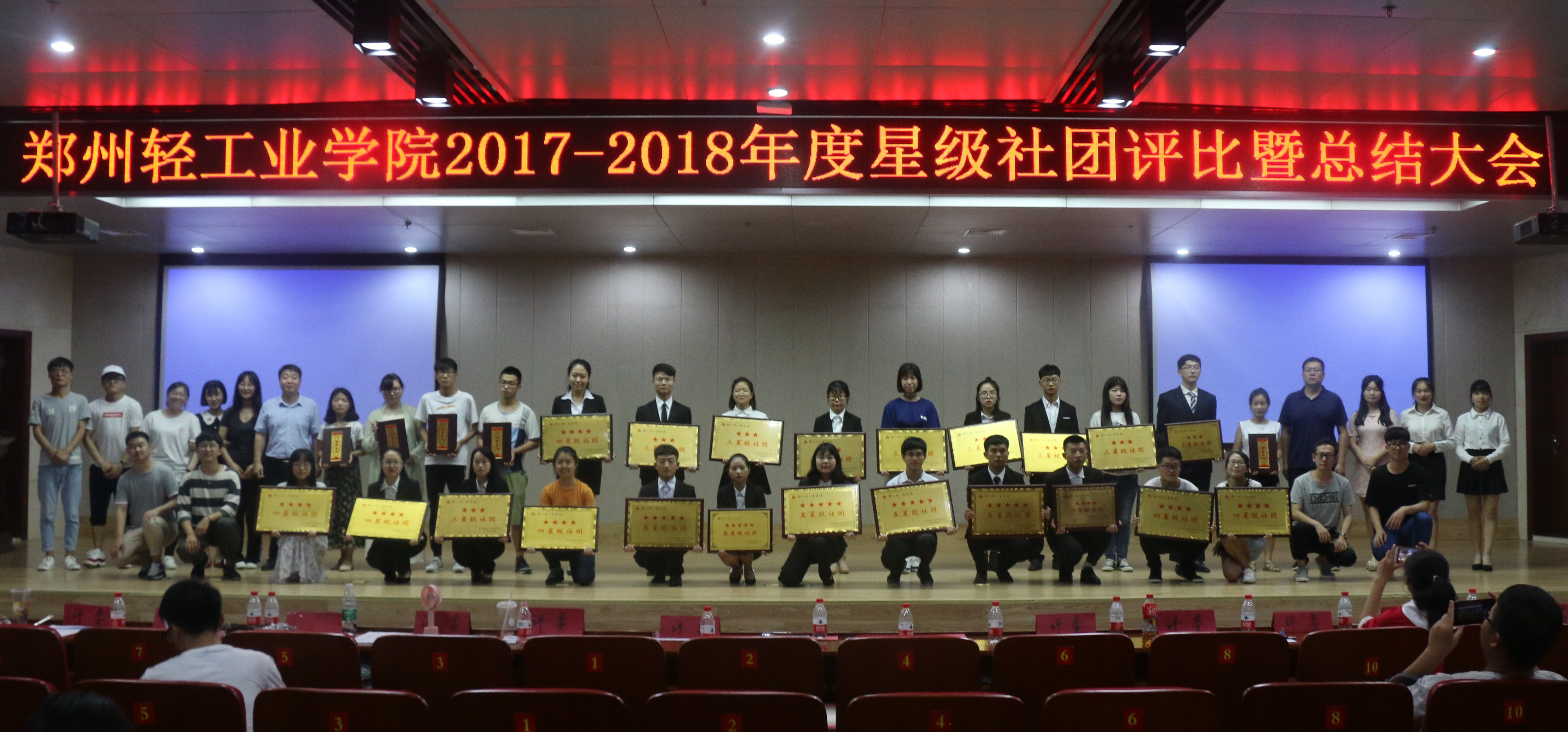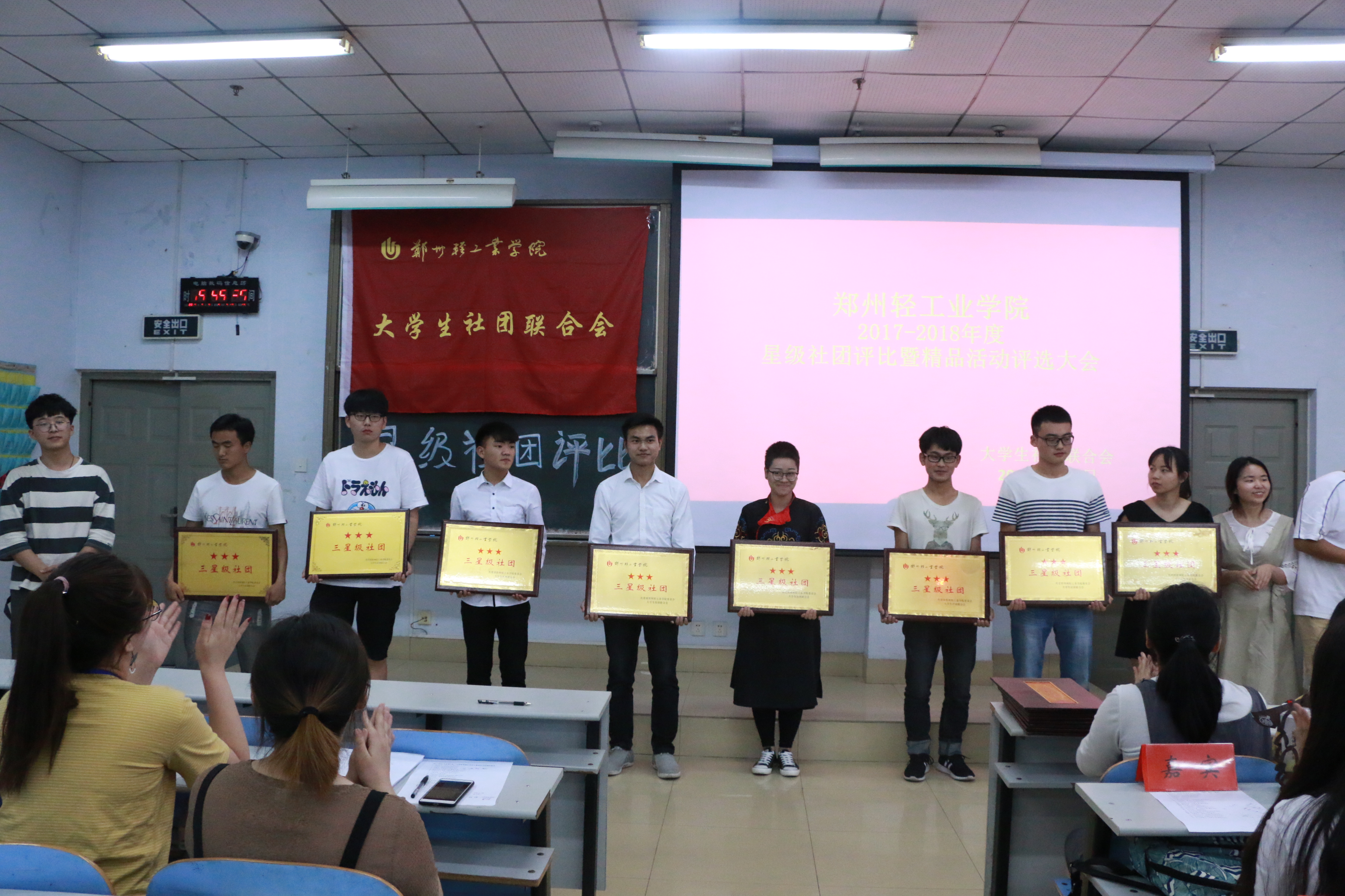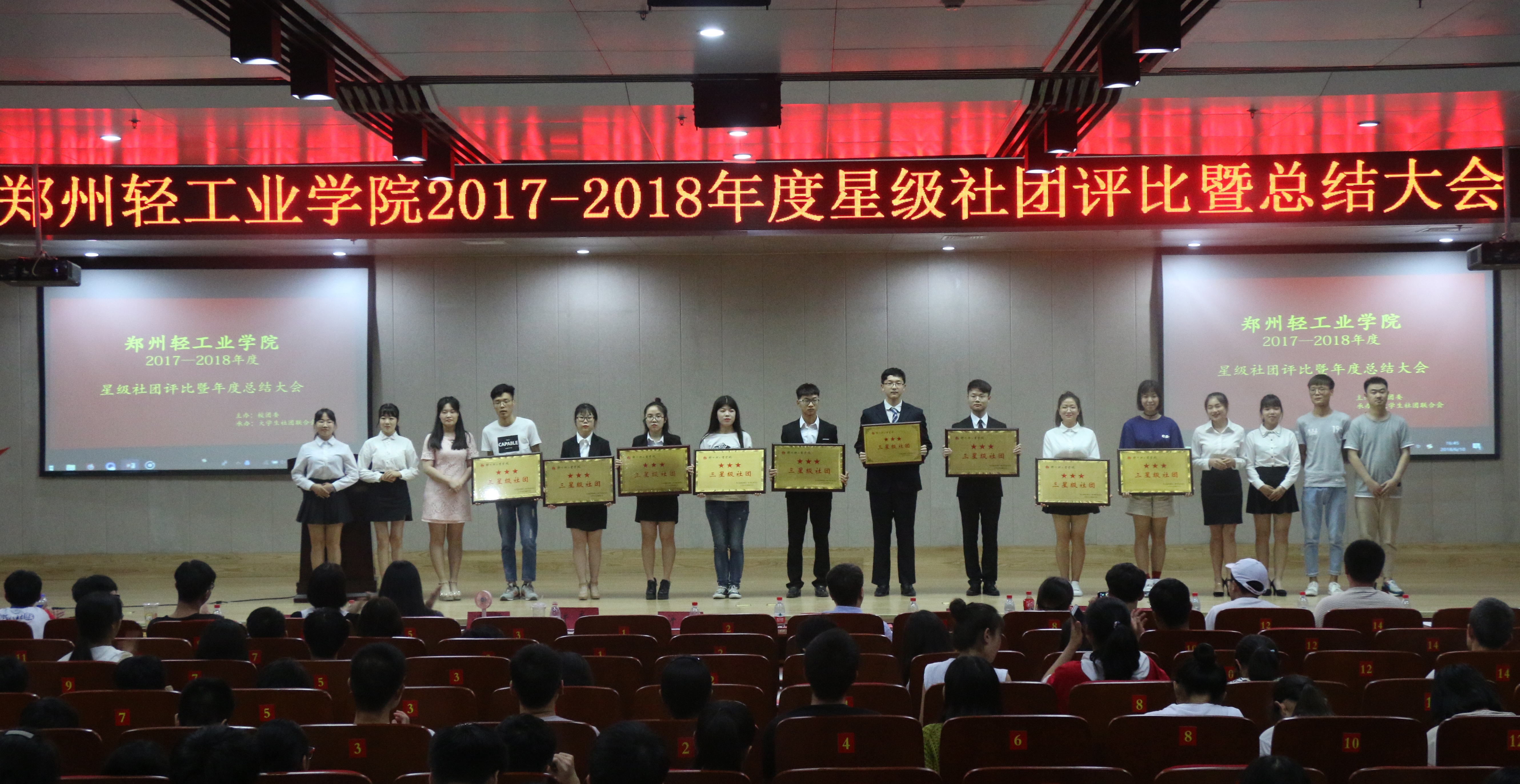 附:社团获奖名单 郑州轻工业学院(东风校区)2017-2018年星级社团名单: 五星级社团:演讲与口才协会、青年志愿者协会、英语沙龙协会、武术协会 四星级社团:羽毛球协会、营销协会、轮滑社、心理协会、动漫社、交谊舞协会 三星级社团:电子科技协会、山水蒙汉服社、计算机爱好者协会、驼铃文学社、读书协会、书画协会、无线电协会、乒乓球协会 精品活动:英语沙龙协会“英语四六级模拟考试”、演讲与口才协会“星光杯社团联合辩论赛”、计算机爱好者协会“义务维修电脑活动”、心理协会“心理文化艺术节文艺演出”、武术协会“轻武国魂”、无线电协会“五五节通联活动”、电子科技协会“家电义务维修”、乒乓球协会“社团交流赛”。 郑州轻工业学院(科学校区)2017-2018年星级社团名单: 五星级社团:青年志愿者协会、英语沙龙协会、演讲与口才协会、电子科技协会、营销协会 四星级社团:读书协会、食品安全与健康协会、排球协会、环保协会、社会工作促进会、摄影协会、篮球协会 三星级社团:A+skater轮滑社、书法协会、动漫协会、武术协会、花艺协会、乒乓球协会、交谊舞协会、计算机爱好者协会、羽毛球协会。 “新锐成长”奖:HelloRunner跑团、网球社、山水蒙汉服社 “精诚合作”奖:大学生法律援助中心、足球爱好者协会、青年志愿者协会 “巧思创新”奖:花艺协会、健身健美协会、营销协会