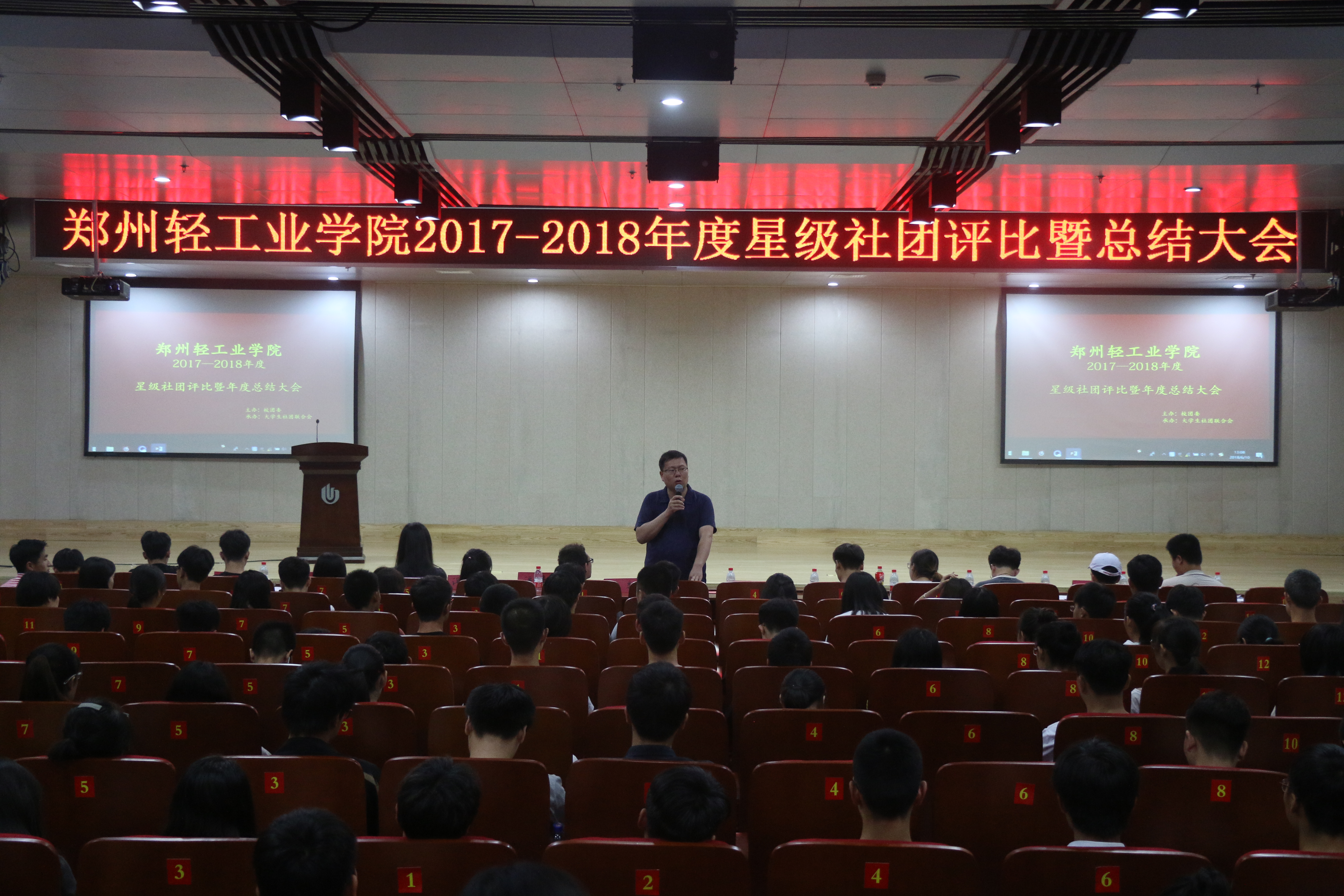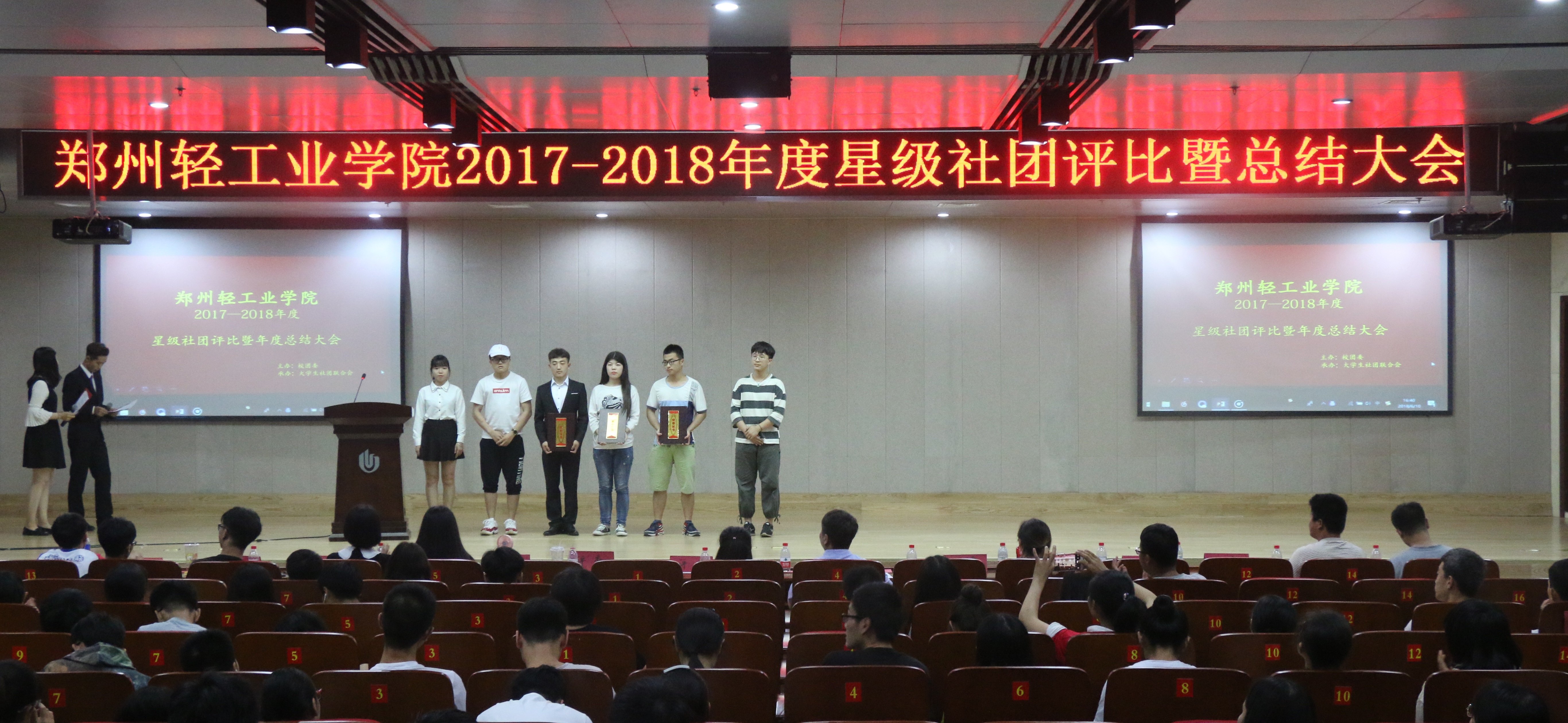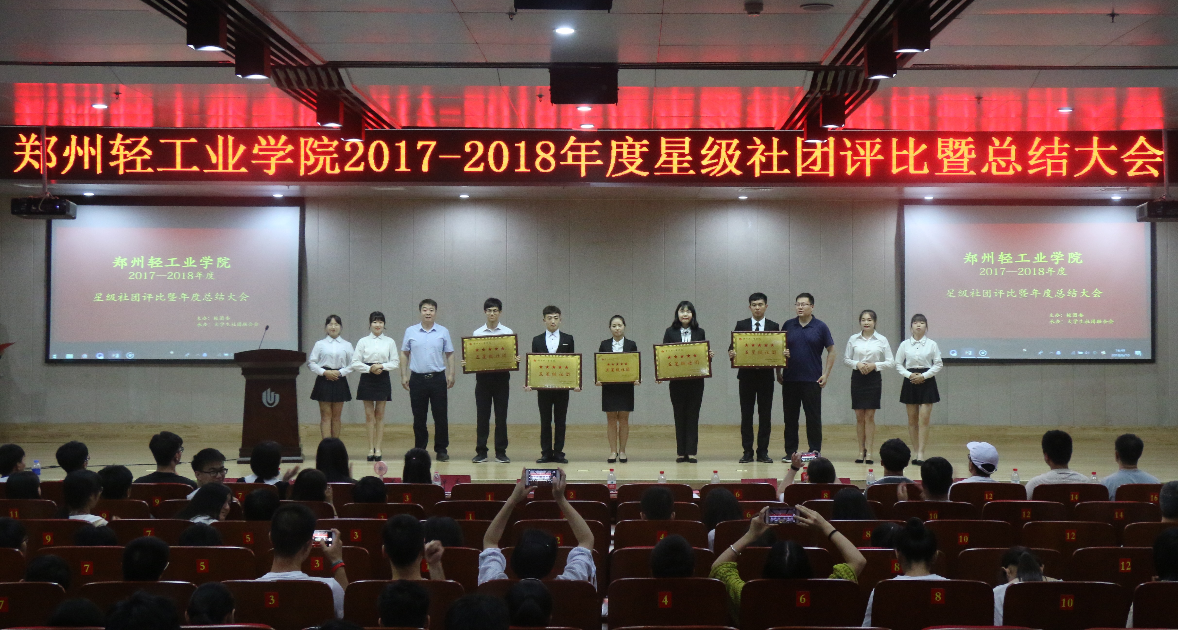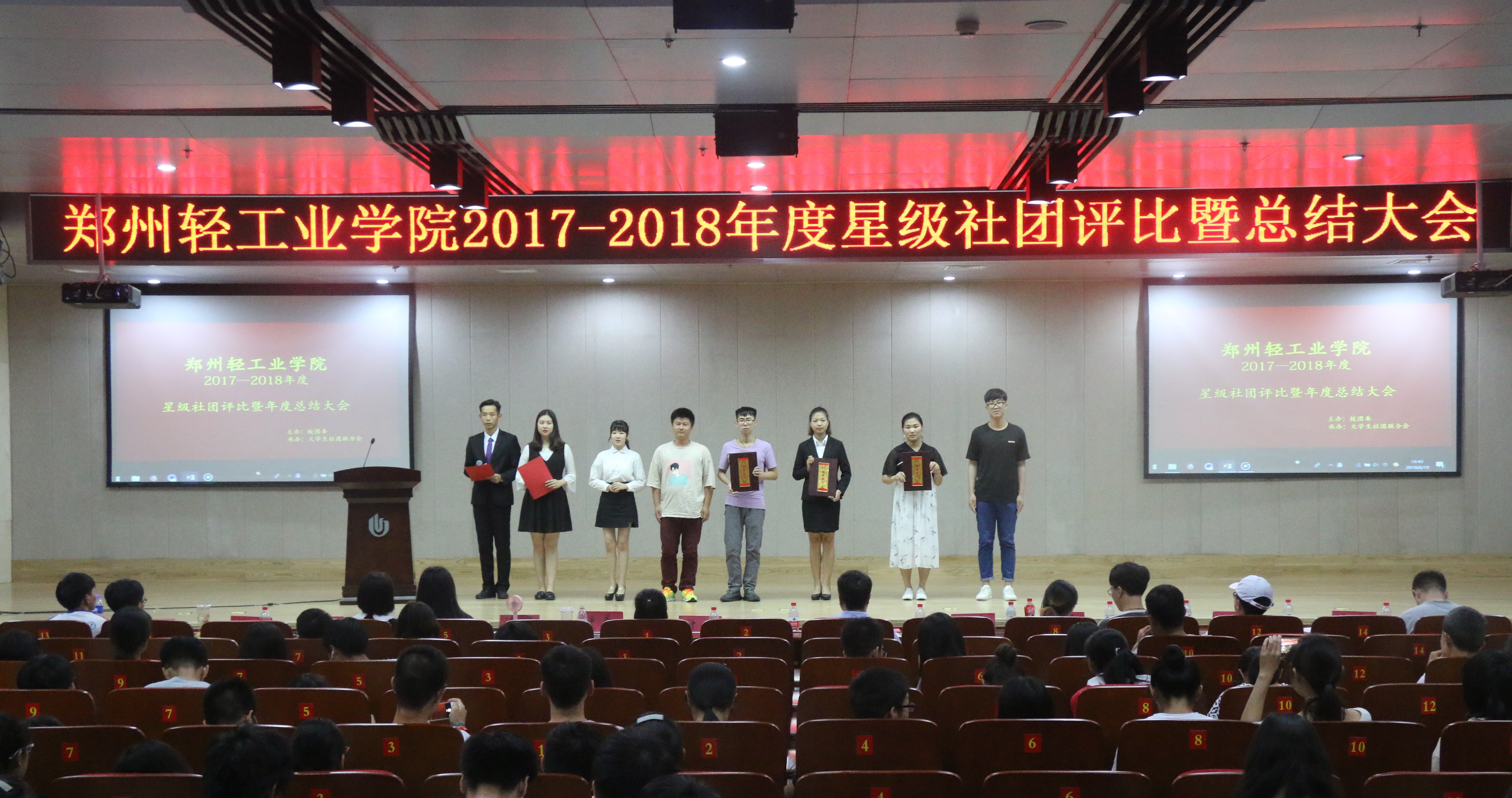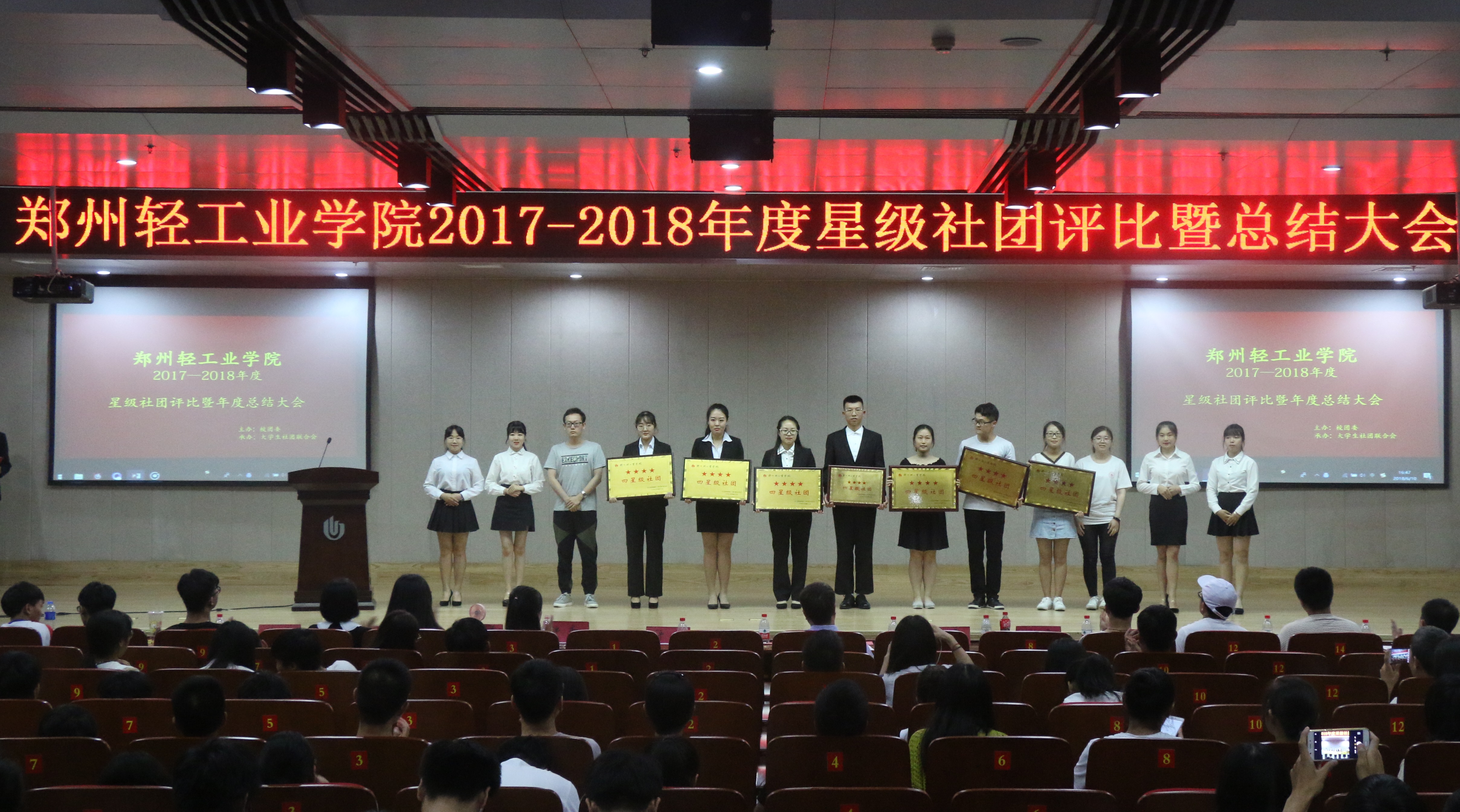 为进一步加强对学生社团的管理,促进社团未来的发展,为各个社团提供一次展现本学年活动成果的机会;同时也为凸显学生社团在校园建设中的作用,6月9及10日,由校团委主办,大学生社团联合会承办的郑州轻工业学院2017-2018学年星级社团评比暨总结大会分别在科学校区逸夫图书馆报告厅和东风校区教三楼100室顺利举行。参与本次活动的嘉宾有:校团委副书记景志勇老师、校团委办公室主任王银峰老师、大学生社团联合会主席范文杰、团工委书记史晨曦、团工委常务副书记袁正、常务副主席陈云、副秘书长叶铭、王慧洁、副主席高国栋、孟磊、左文思、团工委副书记高扬、李丹、张合欢、周宇恒,东风校区办公室主任郑浩、组织部部长朱奕柯以及各社团代表和社联全体成员。 活动伊始,由主持人宣布本次活动正式开始并介绍到场嘉宾。接着活动进入第一项,校团委副书记景志勇上台致辞。他首先对本次大会和近年来我校社团的发展给予了充分肯定和高度的赞扬,同时也指出,社团发展仍存在一些问题,鼓励各社团在今后要勇于创新,保持特色。景书记在讲话中提及本次星级社团评比大会举办的意义,结合当下政府文件说明并举例解释了“十育”理念。他的讲话指明了各社团未来发展的方向,提醒各社团应紧紧围绕“一心双环”重要发展方针,发挥好学生社团的外围延展手臂功能去开展工作,积极为繁荣校园文化生活,丰富学生的第二课堂献出自己的力量。 随后大会进入第二项,各个社团代表轮番上台进行风采展示并接受提问。各个社团代表依次从社团的历史,组织架构,特色文化,社团荣誉,社团展望等多个角度,对社团进行了全方位的展示。他们认识到了自己存在的问题,并且今后决定要寻求突破,在保持特色的基础上勇于创新,举办更多高质量的活动,展示出轻院学子的风采。每11个社团展示完毕后,由主持人公布相应社团的得分情况。33个协会全部展示结束后,本环节暂告一段落,工作人员进行最终计分统计。这期间,由大学生社团联合会常务副书记袁正和常务副主席陈云对本学年工作进行总结性发言。随后依据评比结果,举行颁奖仪式,各嘉宾评委对本年度获得各星级的社团、精品活动及获得新锐成长奖、精诚合作奖、巧思创新奖的社团进行了颁奖。至此,本次大会已接近尾声;在获奖社团代表及嘉宾的合影留念中,本次大会成功落下帷幕。 本次大会的顺利开展有利于各社团未来朝着更加美好的方向发展,希望各社团继续高举中国特色社会主义伟大旗帜,深入贯彻落实党的十九大精神,认真贯彻落实习近平新时代中国特色社会主义思想,按照“一心双环”学生组织格局发挥社团外围延伸手臂功能,充分发挥学生社团在校园文化建设中的作用。相信在社团人、社联人不懈的努力下,各社团活动可以越办越好。